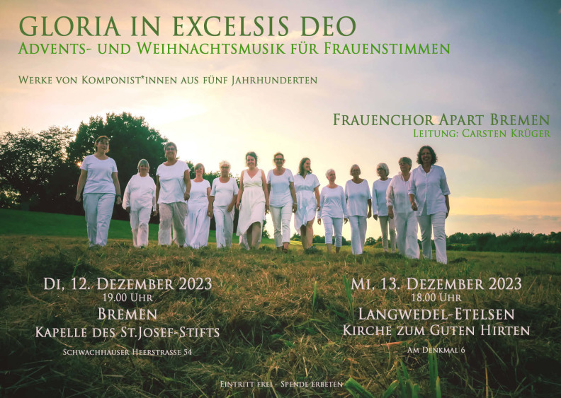 Der Frauenchor apart lädt ein zu weihnachtlicher Musik. Alte und auch viele zeitgenössische 3- bis 8-stimmige Chorwerke werden erklingen und die Stationen des Advents durchgehen, von Marias Schwangerschaft, den Hirten auf dem Feld, und den Engeln, die die Friedensbotschaft verkündigen.