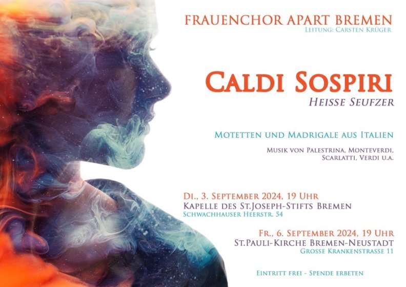 Der Frauenchor apart beteiligt sich mit einem Ausschnitt aus dem kommenden Programm „Caldi sospiri - heiße Seufzer“ und ist von 20:10 bis 20:25 Uhr zu hören.