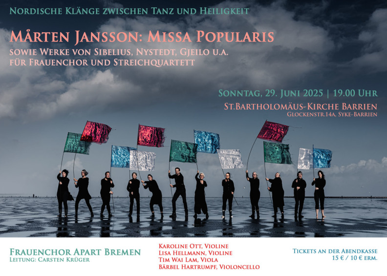 Kurz nach der Mittsommernacht lädt der Frauenchor apart zu einem Konzert mit skandinavischer Chormusik ein. Das Hauptwerk des Abends, die Missa popularis von Marten Jansson, ist eine zeitgenössische Komposition aus vielen folkloristischen Elementen. Jedem Teil der Messe wird ein anderer Tanz zugrunde gelegt. Begleitet wird apart von einem exquisiten Streichquartett. Zudem erklingen Motetten zu Frieden, Hoffnung und Liebe.